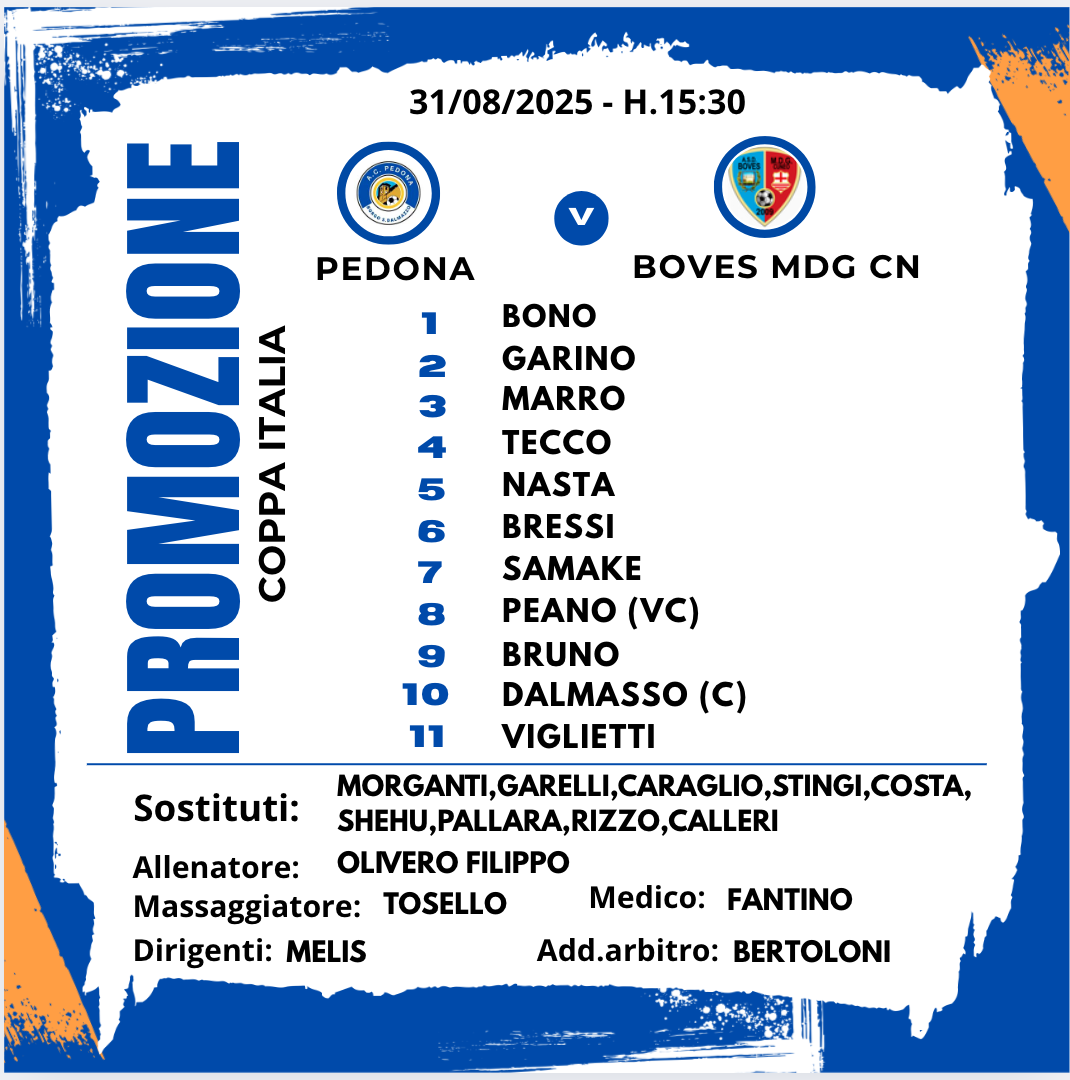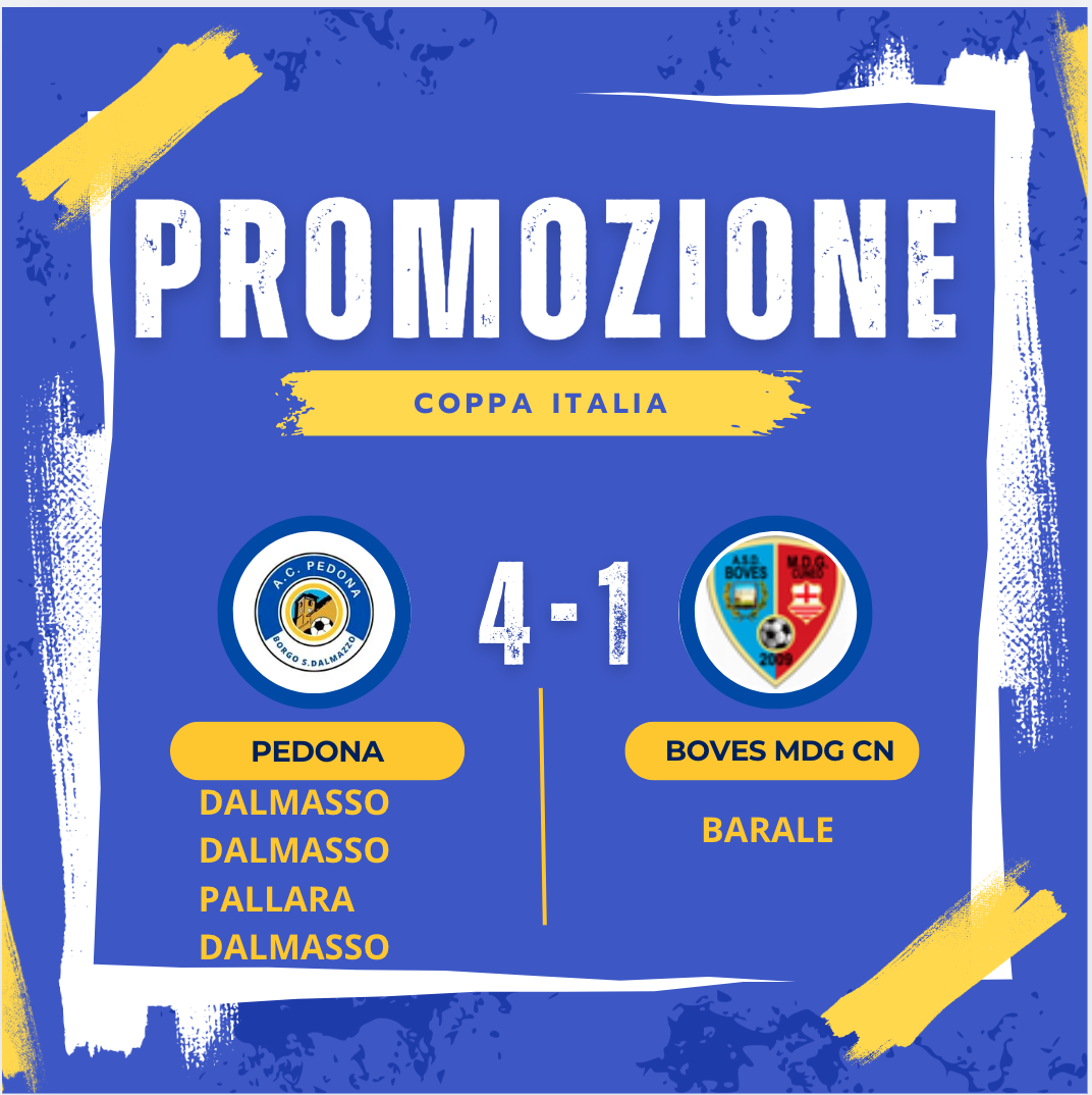 Il Pedona si impone con autorità nel derby contro il Boves, chiudendo con un netto 4-1 e ipotecando il passaggio del turno in Coppa Italia Promozione. A sbloccare il match è il capitano Marco Dalmasso, che apre le danze con il gol dell’1-0. Barale risponde per gli ospiti, riportando momentaneamente il punteggio in parità. Ma è ancora Dalmasso a rimettere avanti i borgarini, firmando una doppietta da leader. Nella ripresa, Pallara allunga e lo stesso Dalmasso chiude i conti, trascinando i suoi con una prestazione da incorniciare