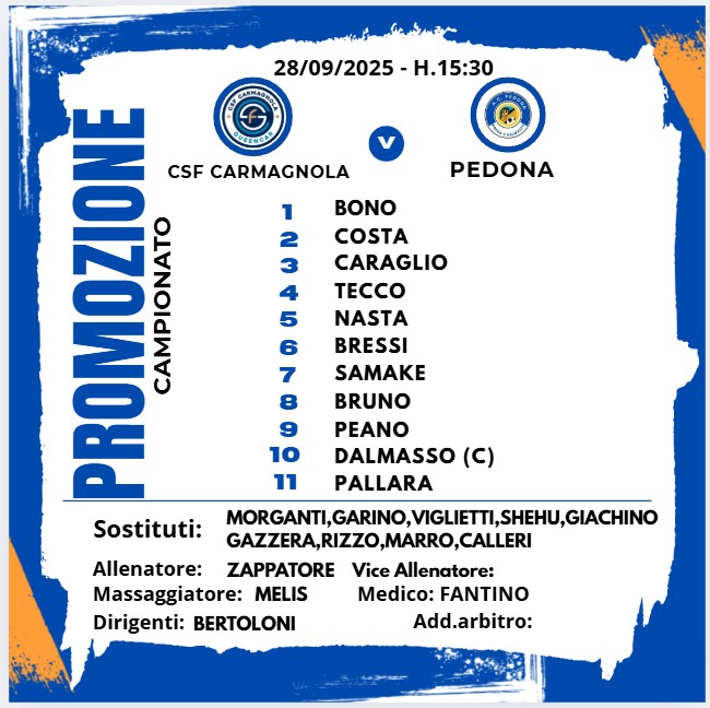 Il Pedona interrompe la sua serie positiva sull'ostico campo del Csf Carmagnola. L’avvio era stato promettente, con Samake che al 5’ minuto sbloccava il risultato su calcio di punizione. I padroni di casa hanno però alzato il ritmo, trovando il pari al 24’ con Carro e il sorpasso al 39’ grazie a Tozzi. Nella ripresa, il copione non è cambiato: al 10’, Savu ha chiuso i conti con un potente tiro dal limite sotto la traversa. Una sconfitta meritata, frutto di una prestazione sottotono, da archiviare e riscattare già nel prossimo impegno casalingo contro l’Orbassano.