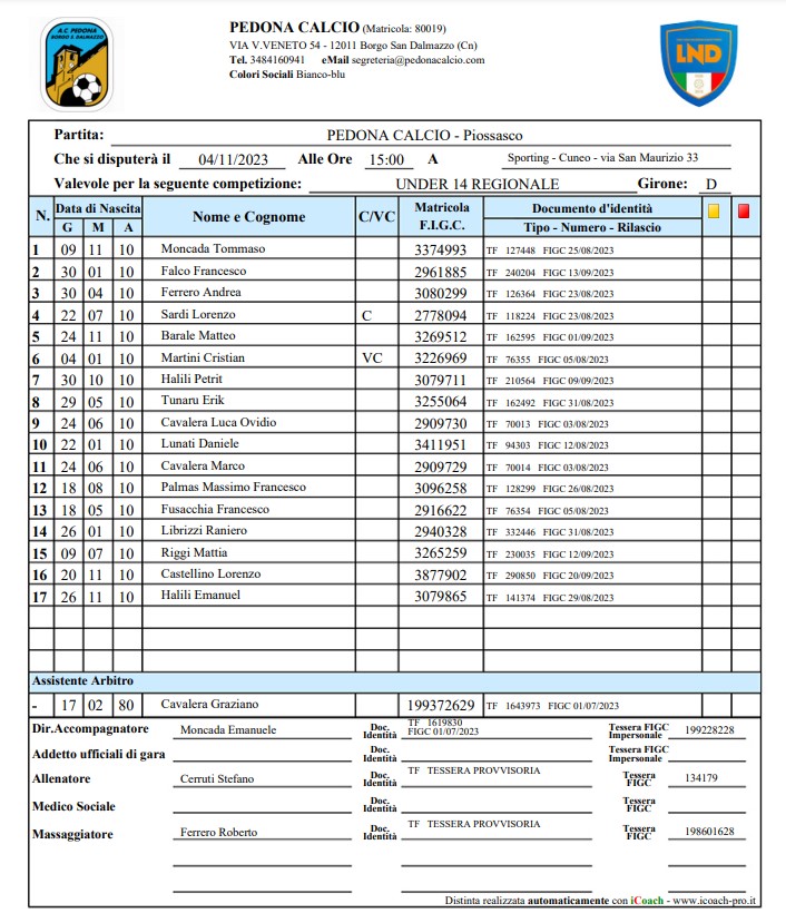 PEDONA vs Piossasco 6-0 (Cavalera Luca 2 - Lunati - Sardi - Martini - Cavalera Marco)