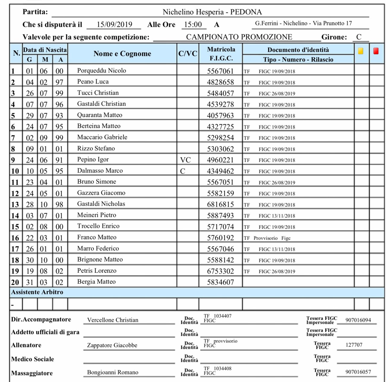 Nichelino Hesperia vs PEDONA 0-3